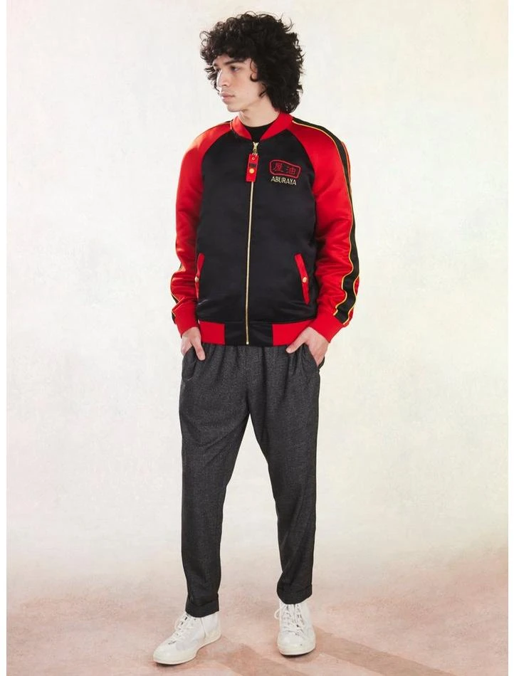 Look fresh while feeling refreshed after a trip to The Bathhouse in this Spirited Away bomber jacket! Featuring red and black color blocking and a gorgeous embroidery of The Bathhouse on the back with “Aburaya” below. Plus, “Aburaya” embroidered at the chest, along with Japanese text. Complete with snap-button front pockets and a front zipper closure.