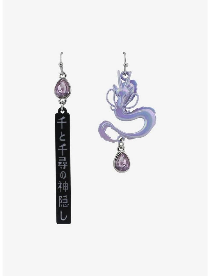 Bring the river spirit to your jewelry collection with this Spirited Away-inspired mismatch earring set. One earring features an iridescent figure of Haku with a purple faux stone drop. The other earring features a purple faux stone and a drop with Japanese text.